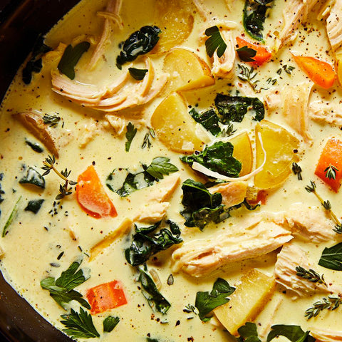A warm and creamy soup with very minimal effort is our ideal dinner. Prep everything in the morning and then come home at night to this delightful soup that will please everyone. No need to sear or use any other skillet. It's hearty and filling and just the thing you need to life up your spirits. The slow cooker makes the chicken completely fall apart while making the potatoes creamy and tender. Use your favorite curry powder to spice up the dish and make it even more comforting. If you aren’t a fan of kale, you can always use spinach or Swiss chard instead!