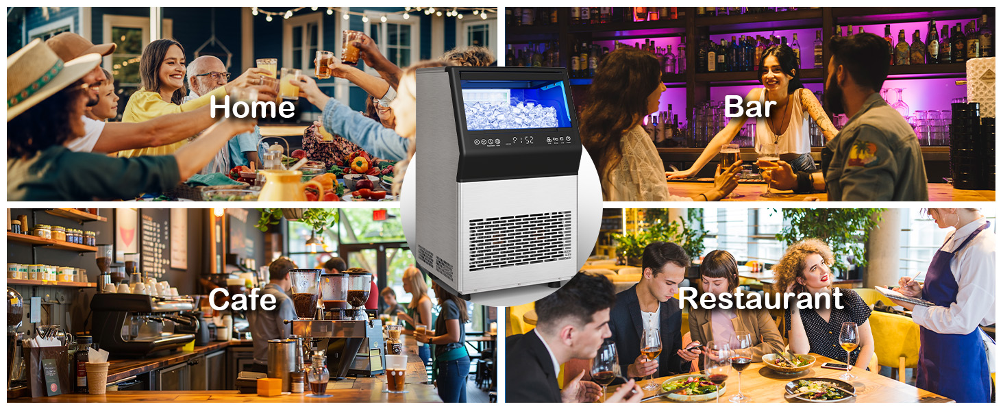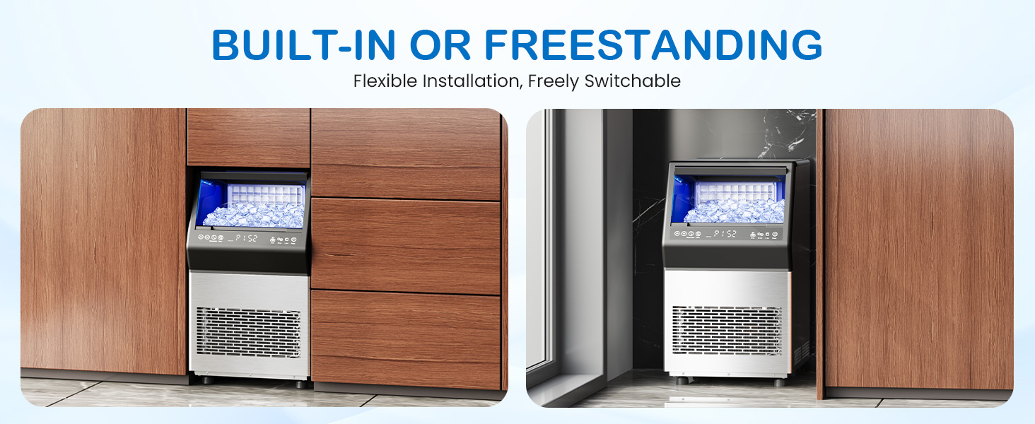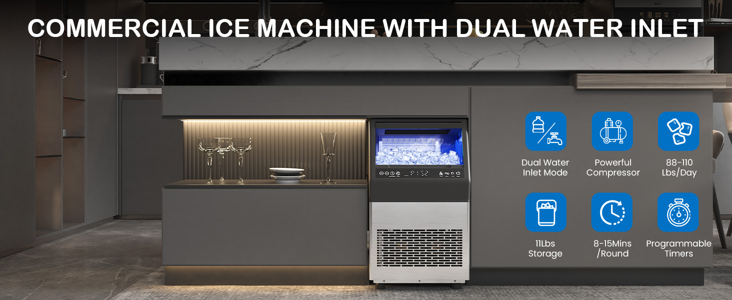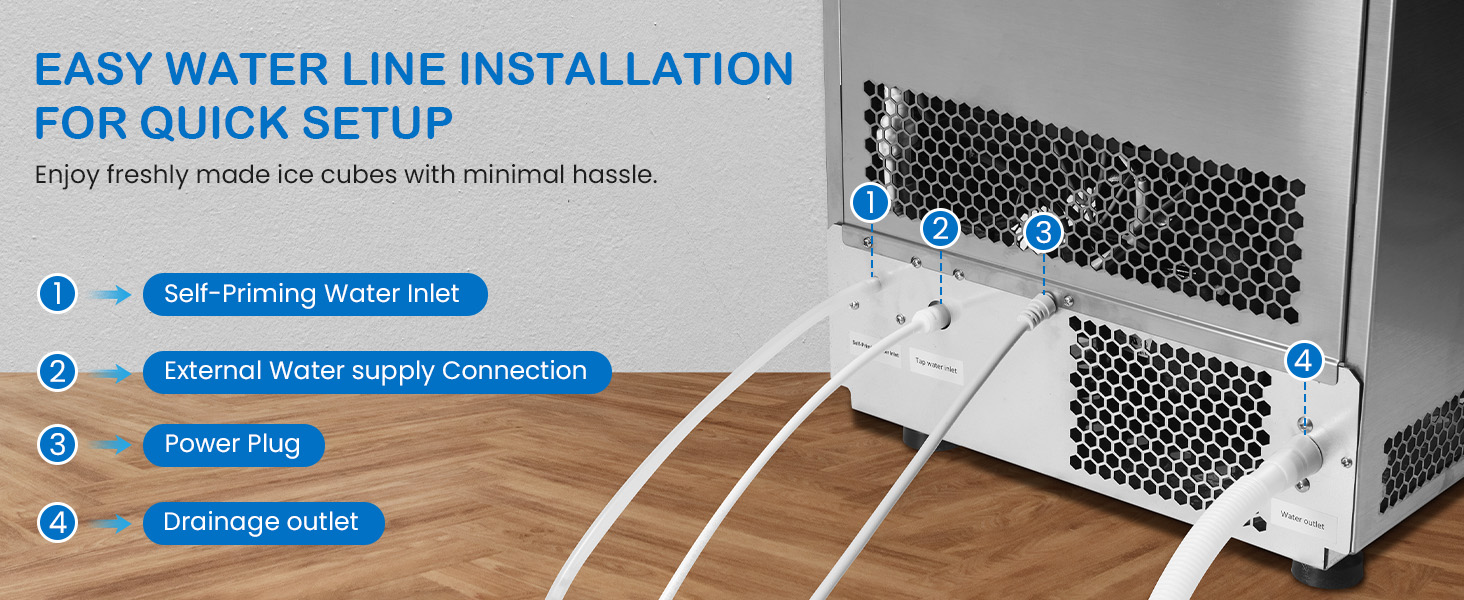 • Efficient and Quiet Ice Production: The powerful compressor allows the under counter ice machine to complete the ice making process efficiently without causing too much noise. Can produce ice cubes in as little as 8-15 minutes (depending on the ice thickness).