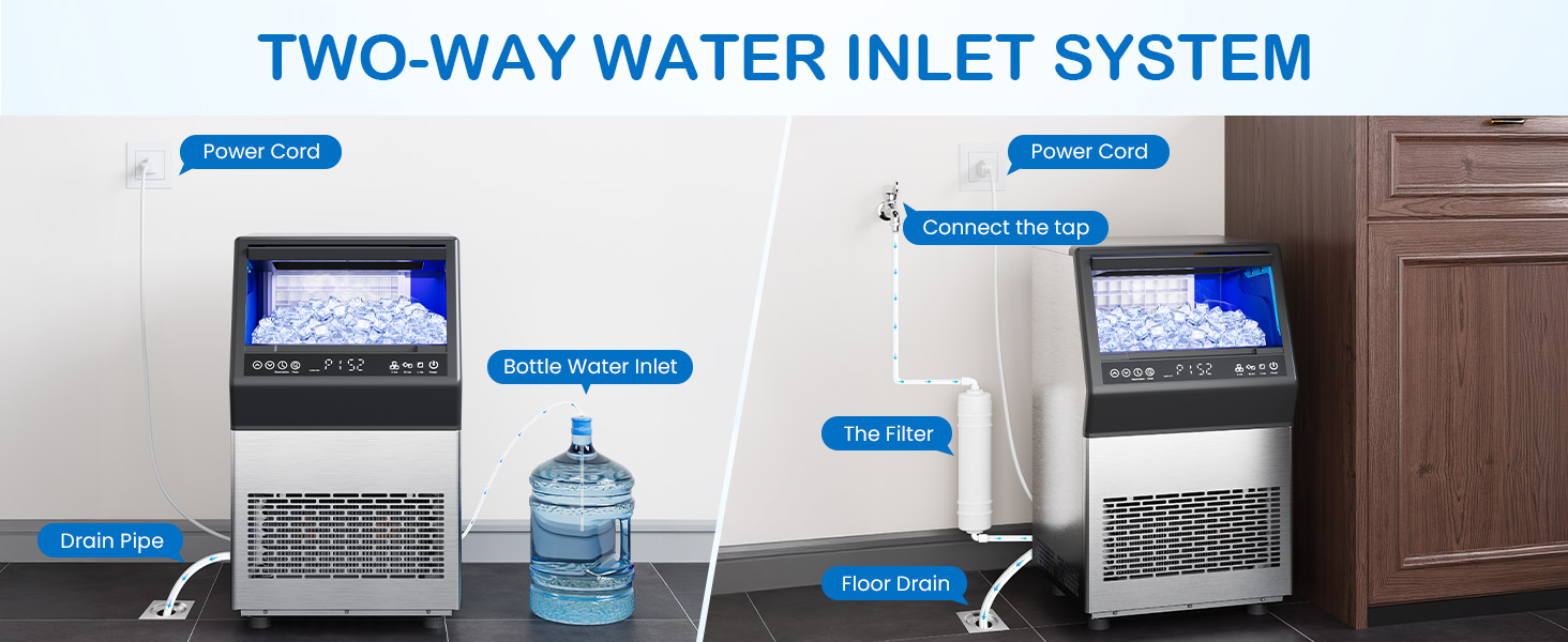 • Dual Water Supply Options Flexibility: Designed for ultimate convenience, the Heynemo commercial ice maker features dual water supply options, allowing you to connect directly to the tap or easily use bottled water. No more worrying about frequent refills or complicated installation. Perfect for home, restaurant, or bar use.
