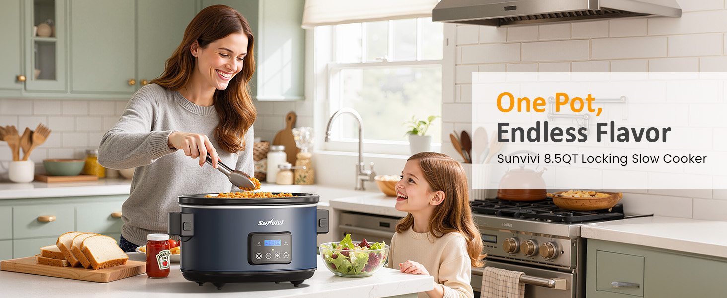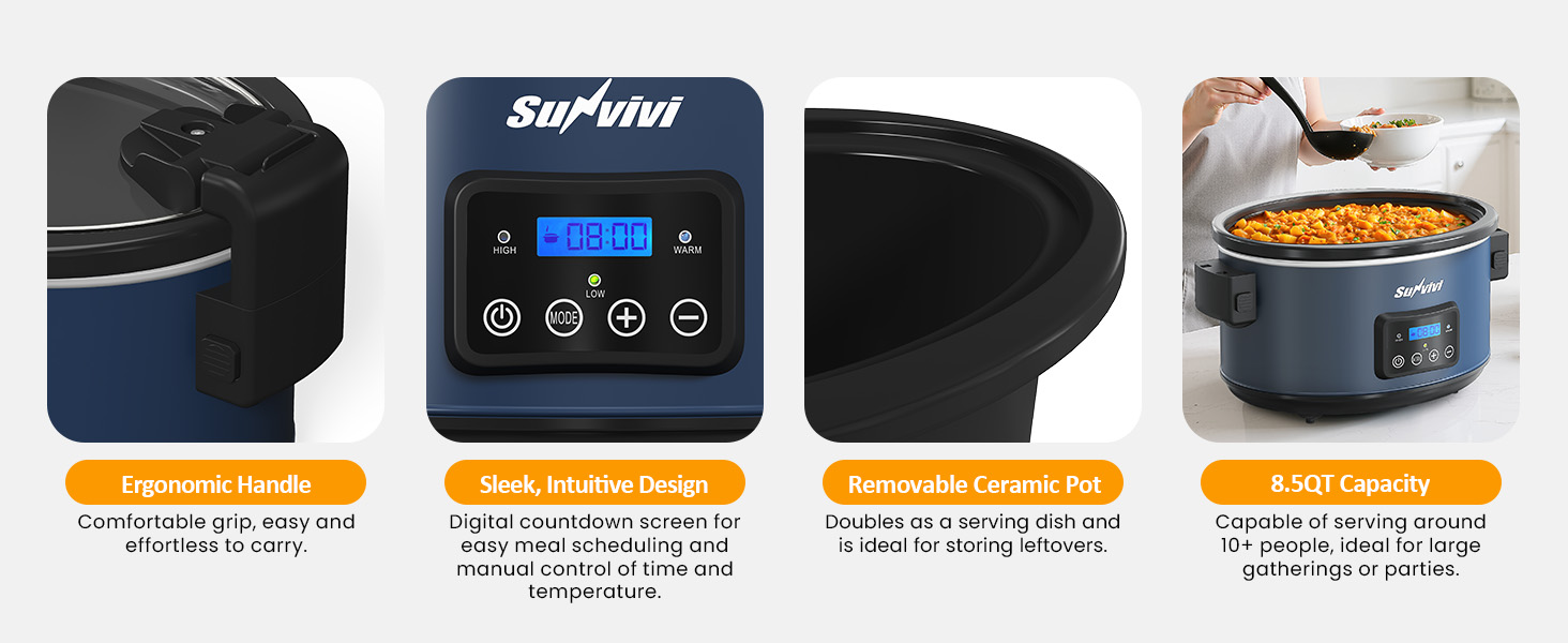 Make family meals simple and enjoyable with the Sunvivi 8.5QT Programmable Slow Cooker with Locking Lid, a versatile multi-cooker designed for gatherings of 10 or more. This digital slow cooker features an extra-large 8.5 quart capacity, making it easy to prepare a whole chicken or a variety of ingredients for holiday feasts or weekend dinners. The programmable slow cooker offers three adjustable temperature settings¡ªlow, high, and keep warm¡ªso your meals are always ready when you are. The spill-proof locking lid ensures secure transport, making it ideal for potlucks and parties. The removable ceramic pot is dishwasher safe for effortless cleanup, while the intuitive LED digital display and one-touch controls make operation easy for everyone. With its stylish blue finish, this slow cooker fits seamlessly into any kitchen and is perfect for those searching for slow cookers 8 qt programmable, programmable slow cookers with lock lid, or portable slow cookers with lock lid. Enjoy convenient, hands-off cooking and spend more time with loved ones using this reliable and easy-to-use programmable slow cooker.