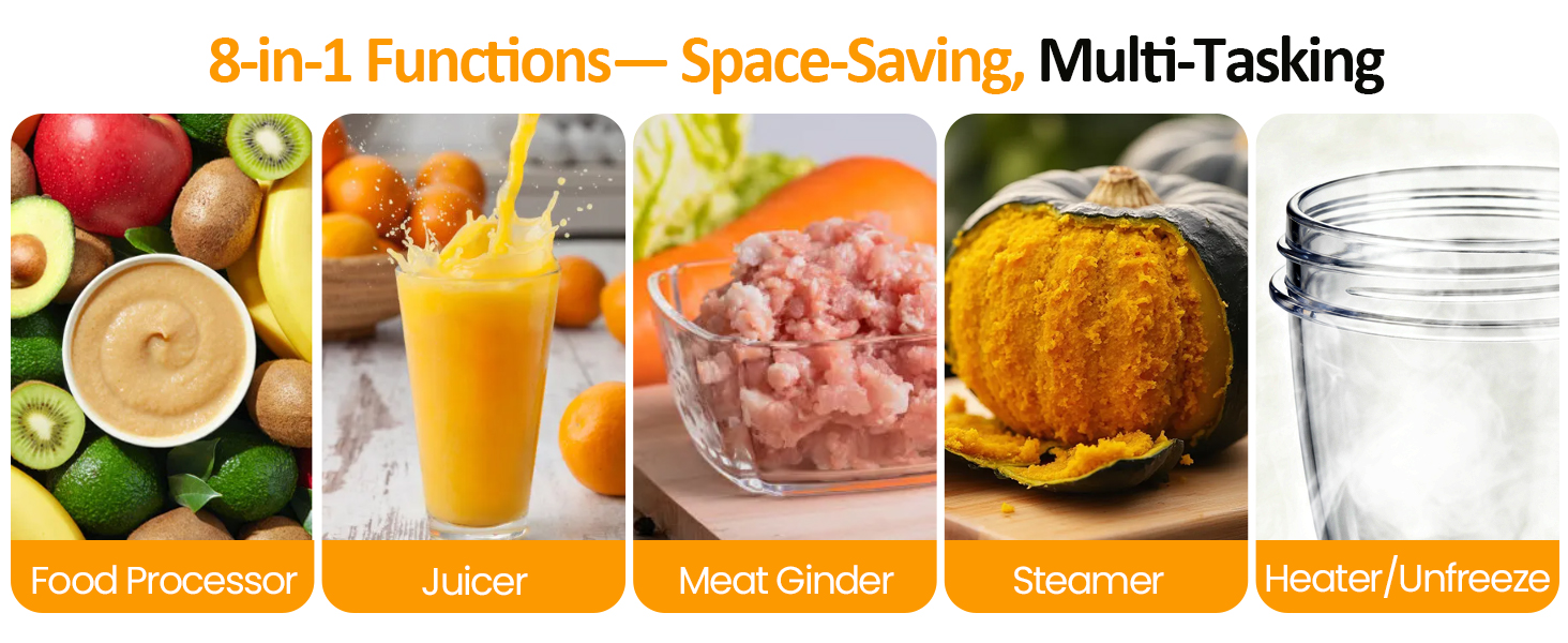 • All-in-One Baby Food Maker for Effortless Meal Prep: Make mealtime simple with this baby food maker electric blender and food processor combo. Perfect for fruits, vegetables, meat, and fish, it combines steaming, unfreeze, heating, automatic and manual stirring—all in one device. Whether you're making smooth baby food purees or family-friendly meals, this baby food processor blender combo saves time and keeps your kitchen organized.