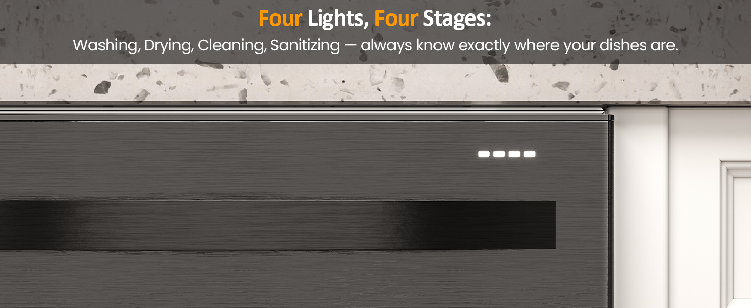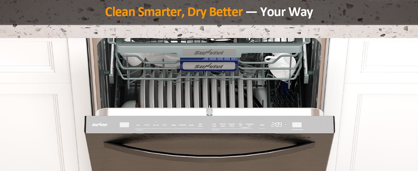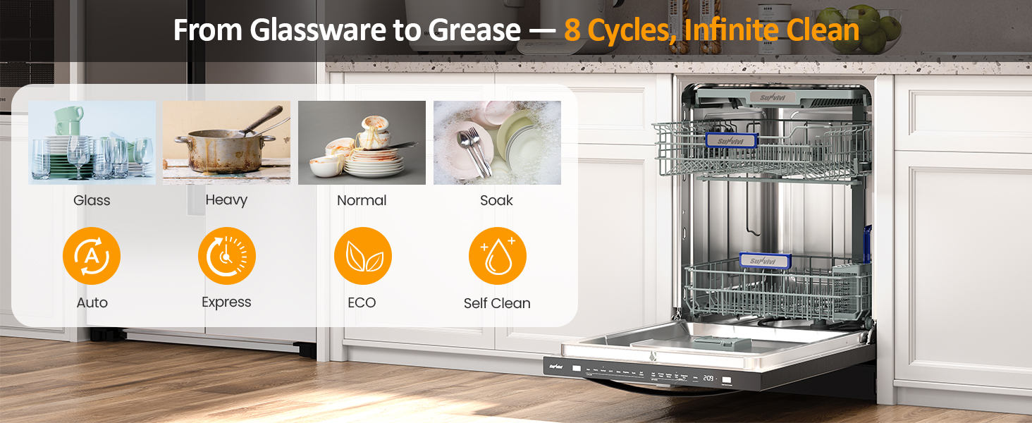 • Choose the Perfect Wash Every Time: Select from 8 programs—Auto, Heavy, Normal, ECO, Glass, Express (35 min), Soak, or Self-Clean—to match your dish load, from delicate glassware to stubborn baked-on grease.