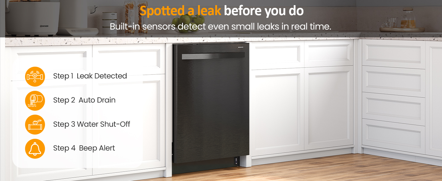 • Feel Safe with Every Wash: Enjoy features like high-temp wash, rinse, heat/extended drying, and sanitization up to 149°F (65°C) to reduce contaminants. The half-load mode saves water and energy when washing smaller loads. An interior light improves visibility, while the leak detection system automatically stops water flow and alerts you. Plus, hidden controls prevent accidental changes.
