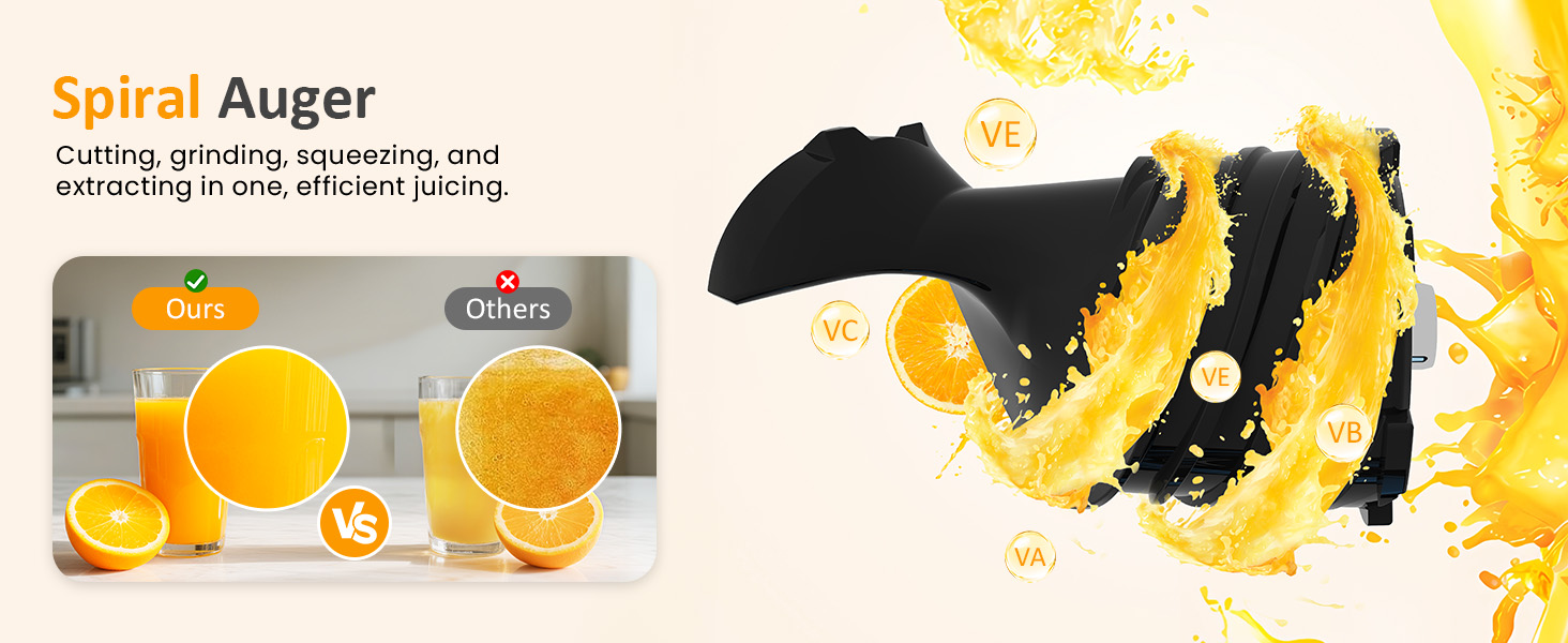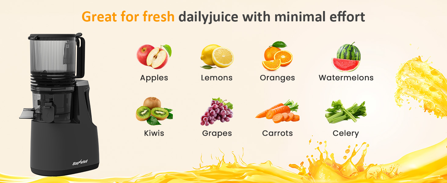 • 5.9-Inch Wide Feed Chute – Fits Whole Fruits: Our industry-leading 5.9-inch (15cm) wide-mouth feed chute saves you prep time by allowing whole apples, oranges, and other fruits to be inserted directly—no pre-cutting needed, just drop and juice.