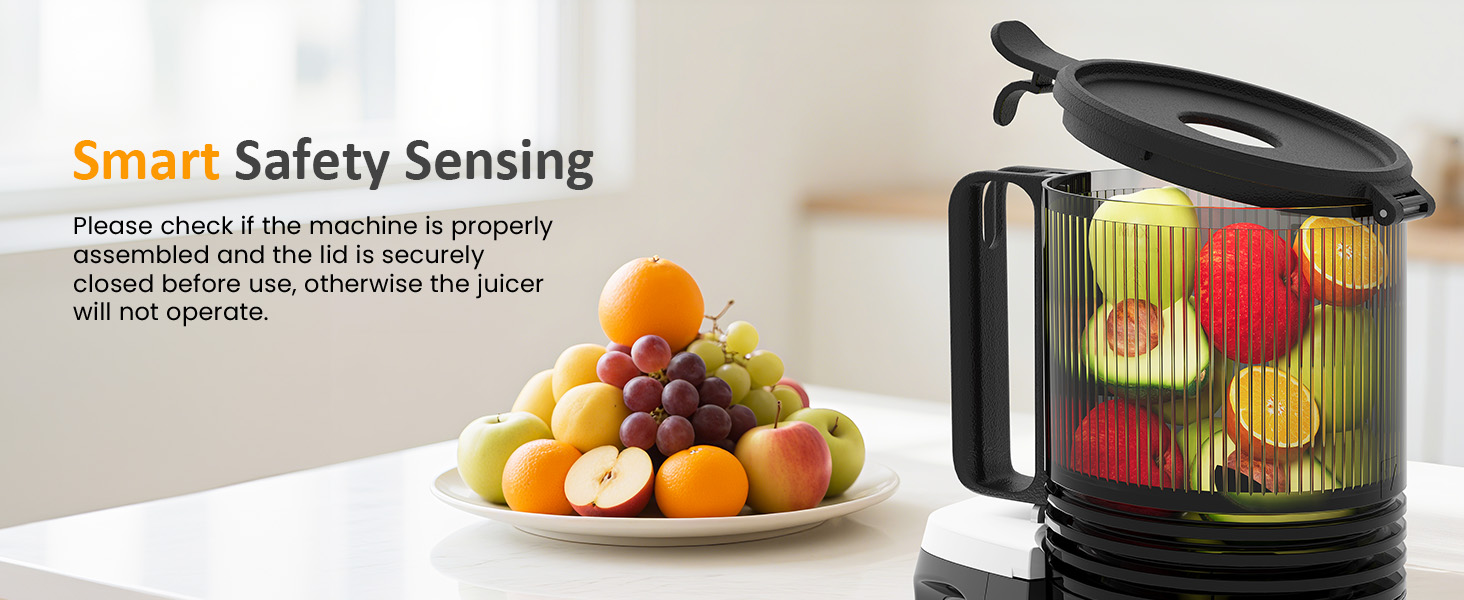 • Intelligent Safety Protection: To ensure user safety, our masticating juicer is equipped with a safety sensor that automatically stops the machine when the lid is opened. The built-in safety lock ensures the juicer can only operate when fully and correctly assembled.