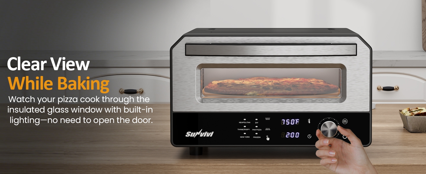 • Easy Operation & Clear Monitoring: Equipped with an intuitive LED digital display and rotary knob system, this pizza cooker makes control simple. The see-through glass door and internal lighting let you monitor your pizza without opening the door—no more overcooked disasters.