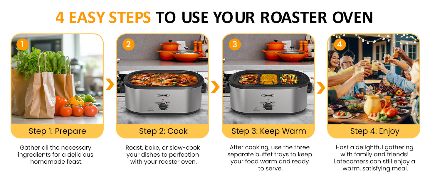 3 Efficient Buffet Trays: Our electric roaster oven features 3 separate buffet server trays that let you cook a variety of foods at the same time. After roasting your chicken to perfection, you can use the trays to keep side dishes like mashed potatoes, vegetables, and gravy warm. It simplifies meal prep and adds much convenience to your hosting duties.