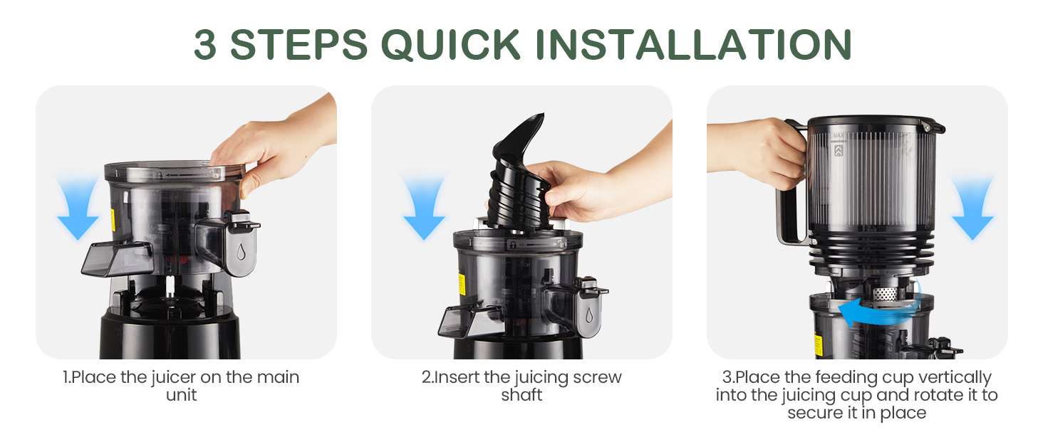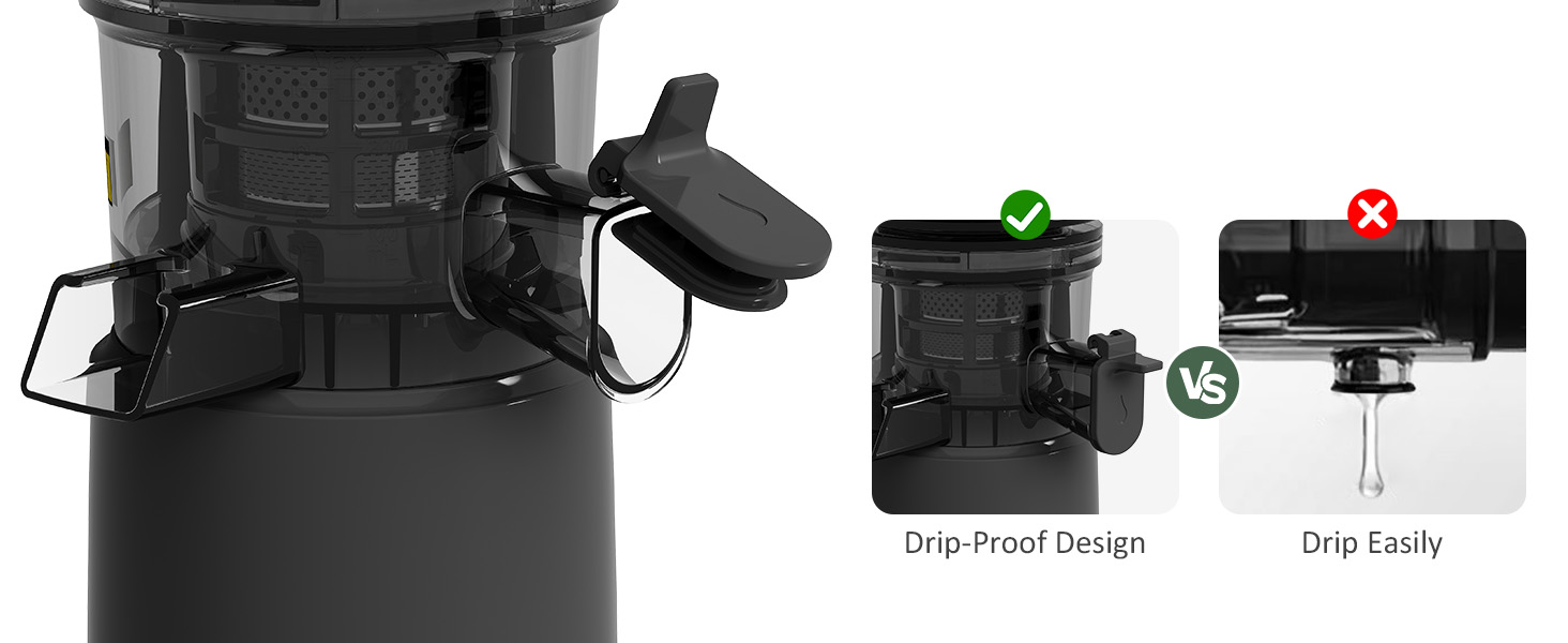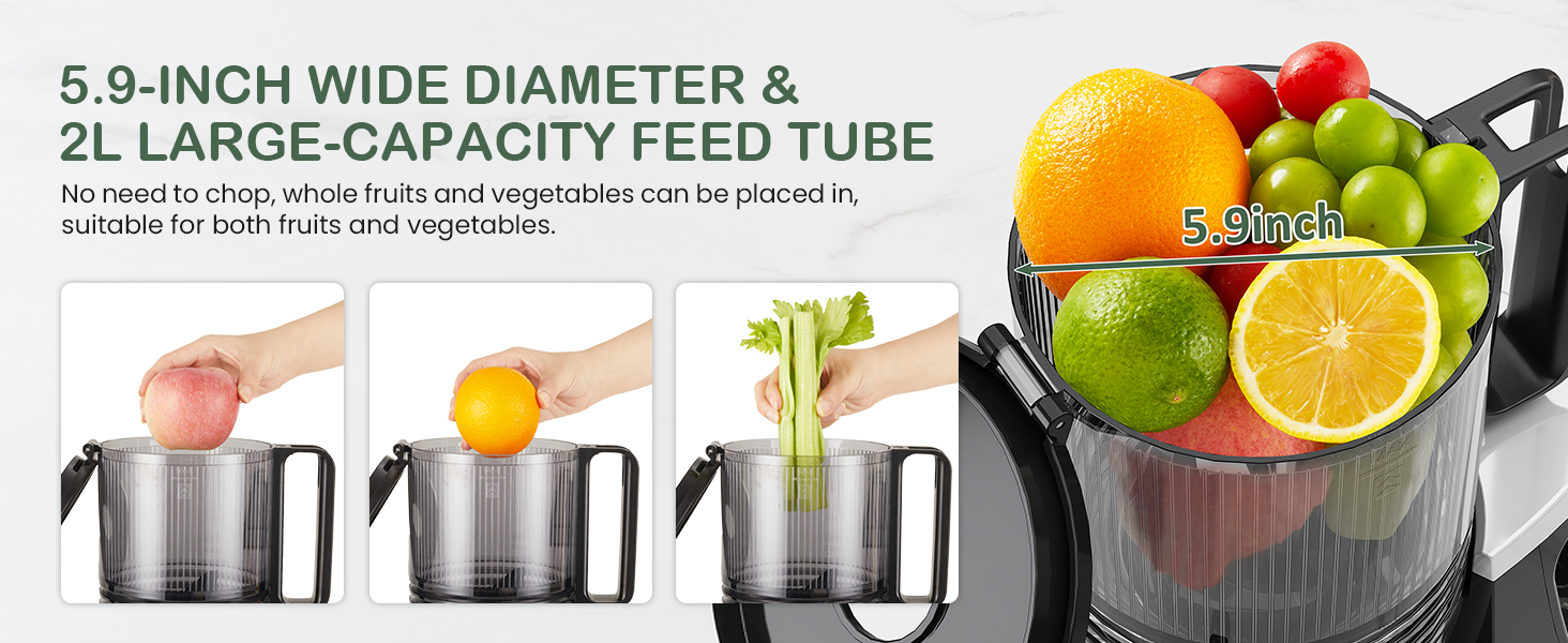 • 5.9” Extra-Wide Feed Chute – No Pre-Cutting Needed: Features a 14.6cm ultra-wide chute, upgraded from standard 5.8", allowing whole fruits like apples and carrots to go in directly—saving prep time and preserving juice purity.
