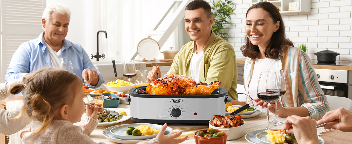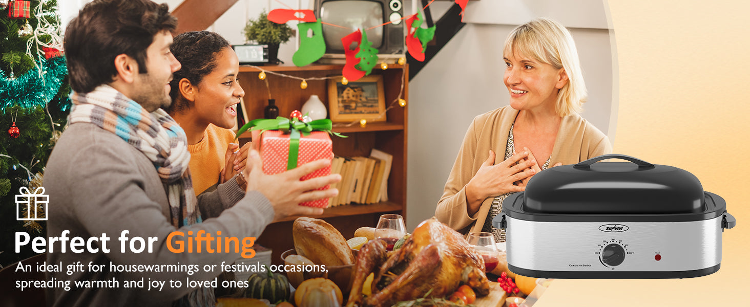 A Perfect Gift: Whether it's the joy of daily kitchen creations, the warmth of festive gatherings during Thanksgiving and Christmas, or the lively atmosphere at parties, this turkey roaster adds a touch of culinary delight. Rest easy with a one-year warranty, ensuring your shopping satisfaction.